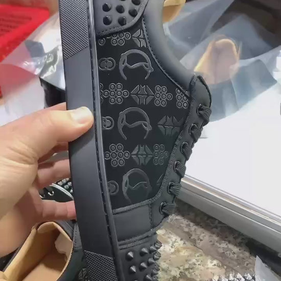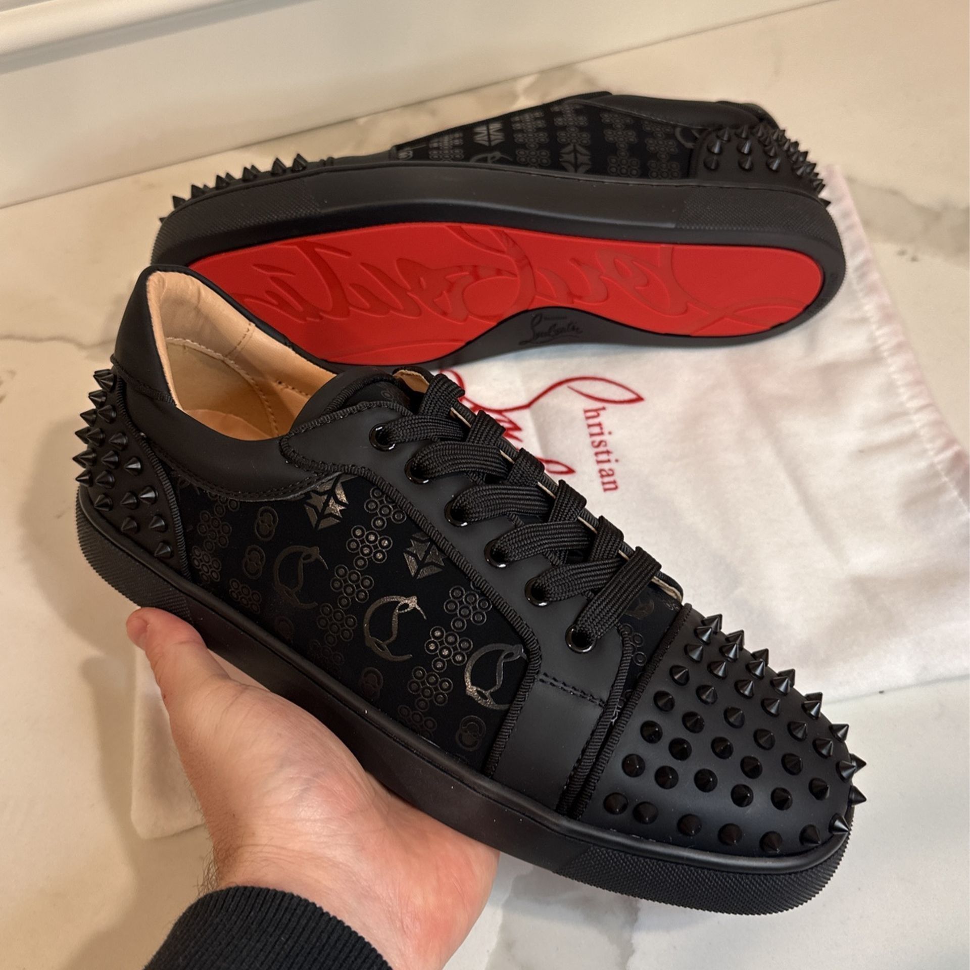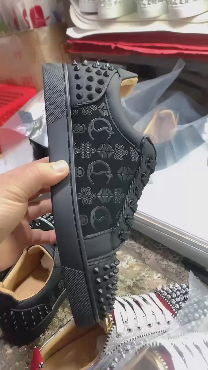 Taking inspiration from the tennis shoes of the 1980s, the Louis Junior Spikes Flat effortlessly blends retro chic with audacious modern elements. A master of reinvention, this sneaker takes on new textures and fabrics each season. This model features a classic look in all-over soft Black Veau Velours, for those days when only timeless style will do. Signature Black spikes adorn the toe.